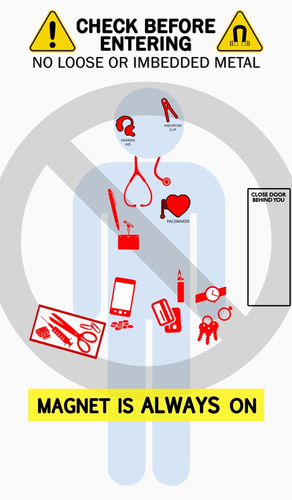 Posters were usually hung on doors prior to entry into MRI rooms. These posters may be used as visual guides for safety checks prior to entering, or as a final reminder of what not to bring beyond this point.